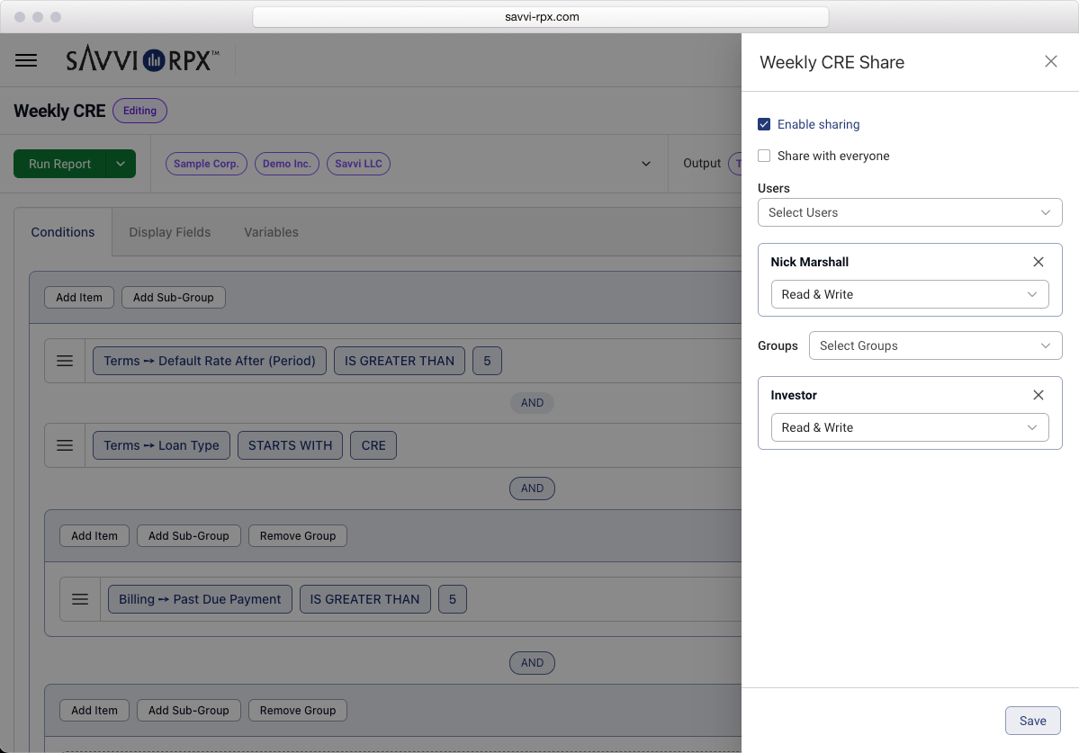 - Designate specific users or groups as read-only or give them access to edit or make copies of your report.