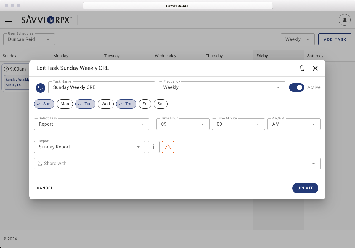 - Schedule your report monthly or by a day of the week at a time of your choosing.